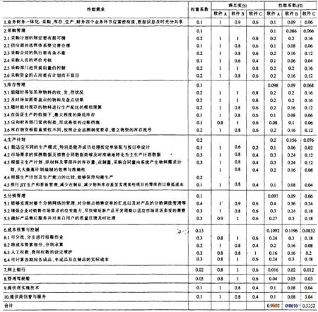 表3ERP项目性能需求与备选软件(含提供商)的性能系数