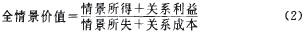 为将(2)数值化,设全情景价值为wsV(wholescenevalue)、情景所得为SP(sceneprofit)、情景所失为SL(scenelosing)、关系利益为PR(profitbyrelationship)、关系成本为CR(costofrelationship)。式(2)可改写为: